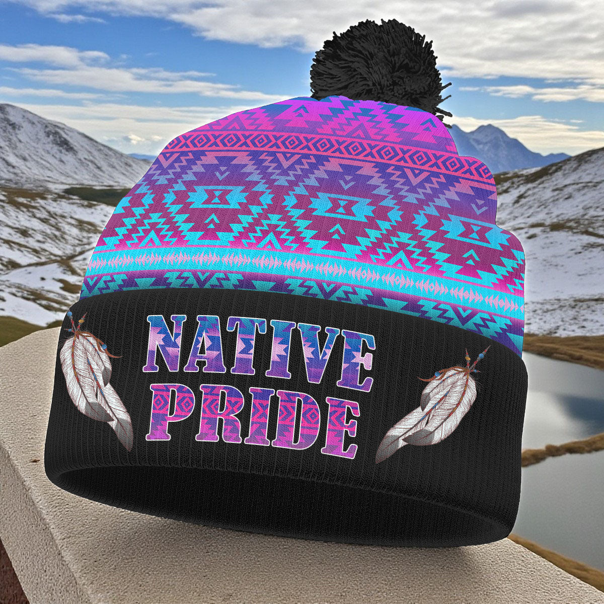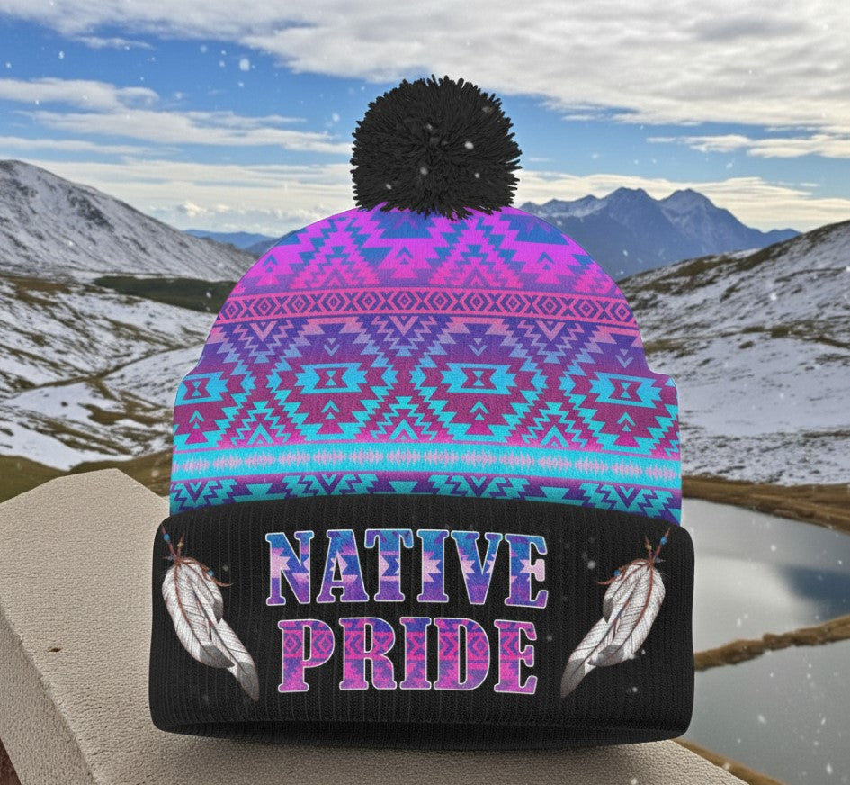 3AMSZZ22-04 Feather Native American Knitted Hat With Pom-Pom