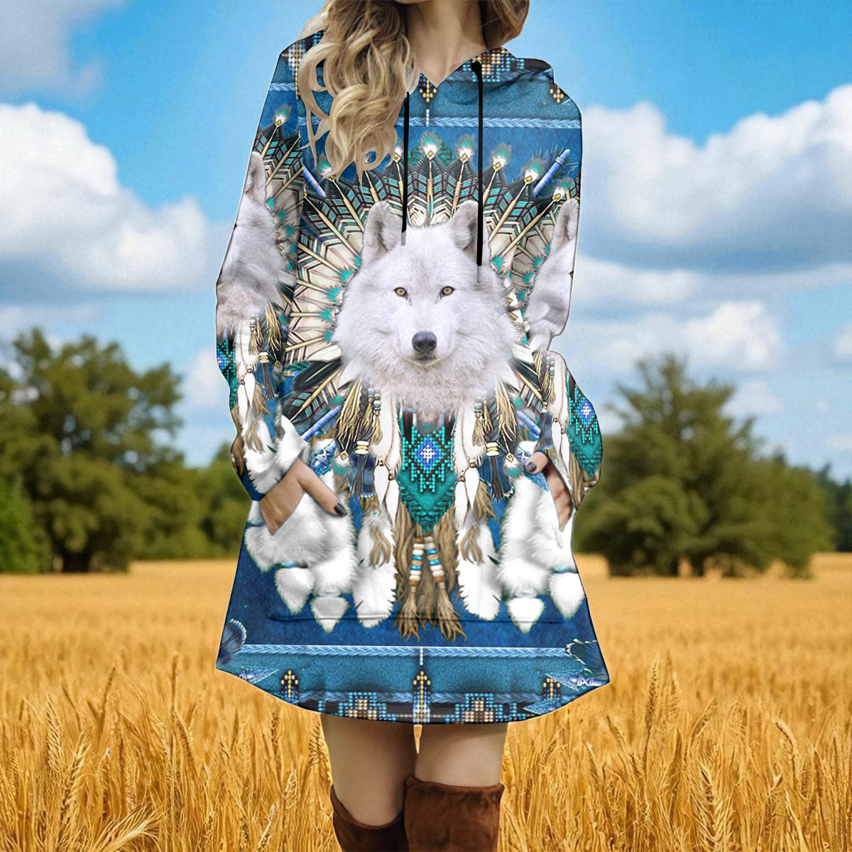 GB-NAT00648 Wolf Native American Women Longline Hoodie Dress