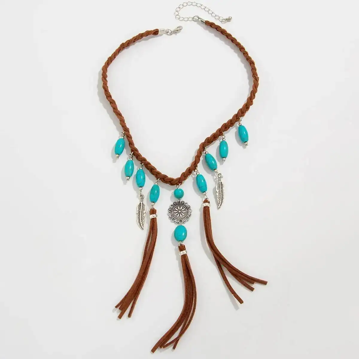 Boho Ethnic Feather Tassel Choker Necklace – Stone Pendant on Woven Rope Chain